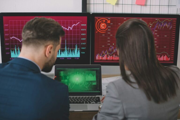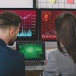back-view-of-analysts-working-on-vulnerability-of-computer-systems-with-chart...